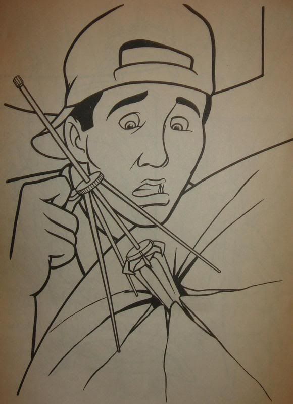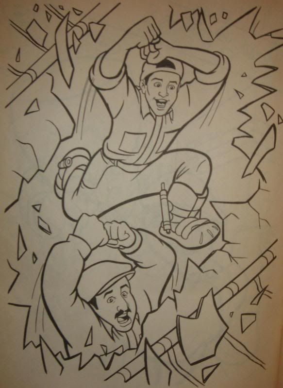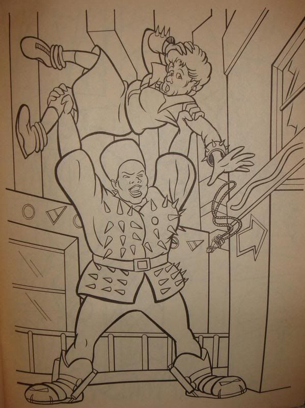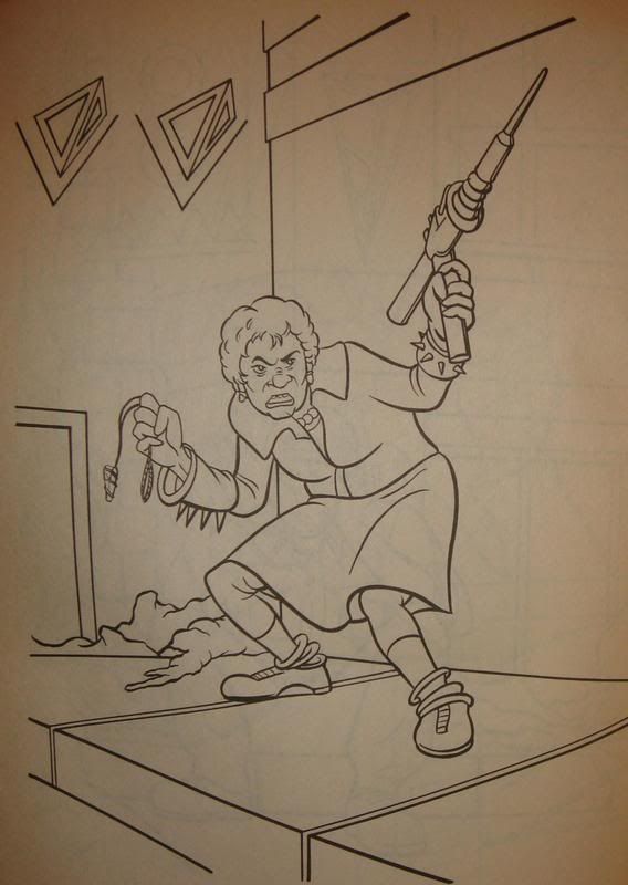 Ba-ha-ha-ha-ha-ha! Oh, man, I'm laughing my ass off at those drawings. So it's an improvement over the Ghostbusters II coloring book, but...Toad has a freaking Crescent Roll (apologies to Pillsbury) on his forehead. I'll say that again so it sinks in: HE HAS. A CRESCENT ROLL. ON HIS FOREHEAD. Sheer hilarity. And don't get me started on that old lady...she looks seriously freaky.